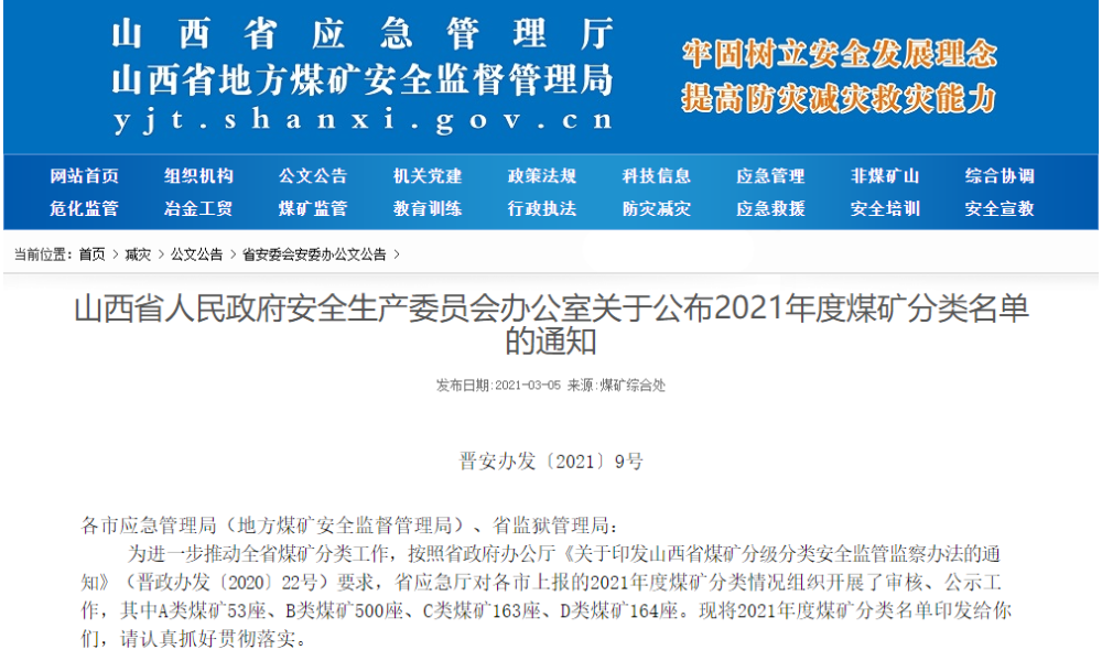 其中:A類煤礦53座、B類煤礦500座、C類煤礦163座、D類煤礦164座